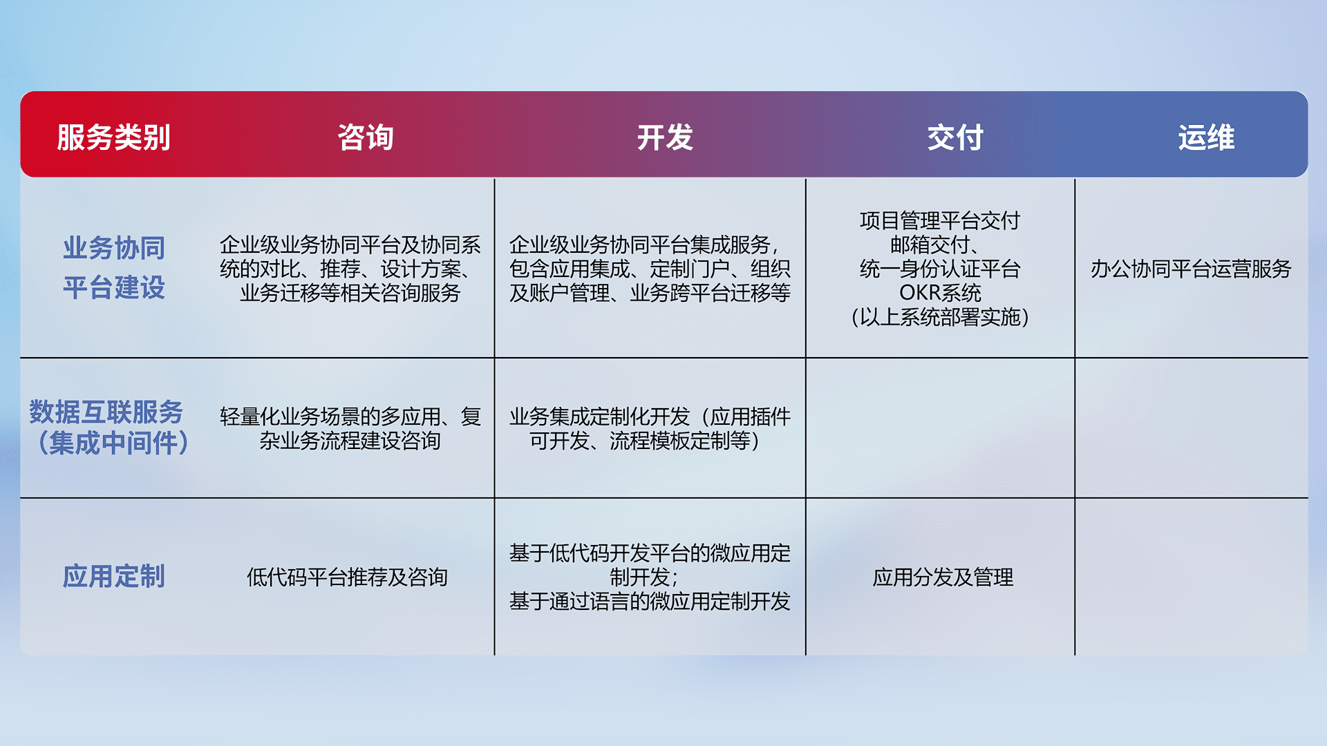 针对钉钉、、、企微、、、、IDaas等平台级产品提供产品的规划、、、方案、、、、交付、、、定制化开发等服务,,实现如统一协同办公、、、、智能客户服务、、、混合会议管理、、、智能数据查询、、、、等业务场景,,,实现数字化转型。。